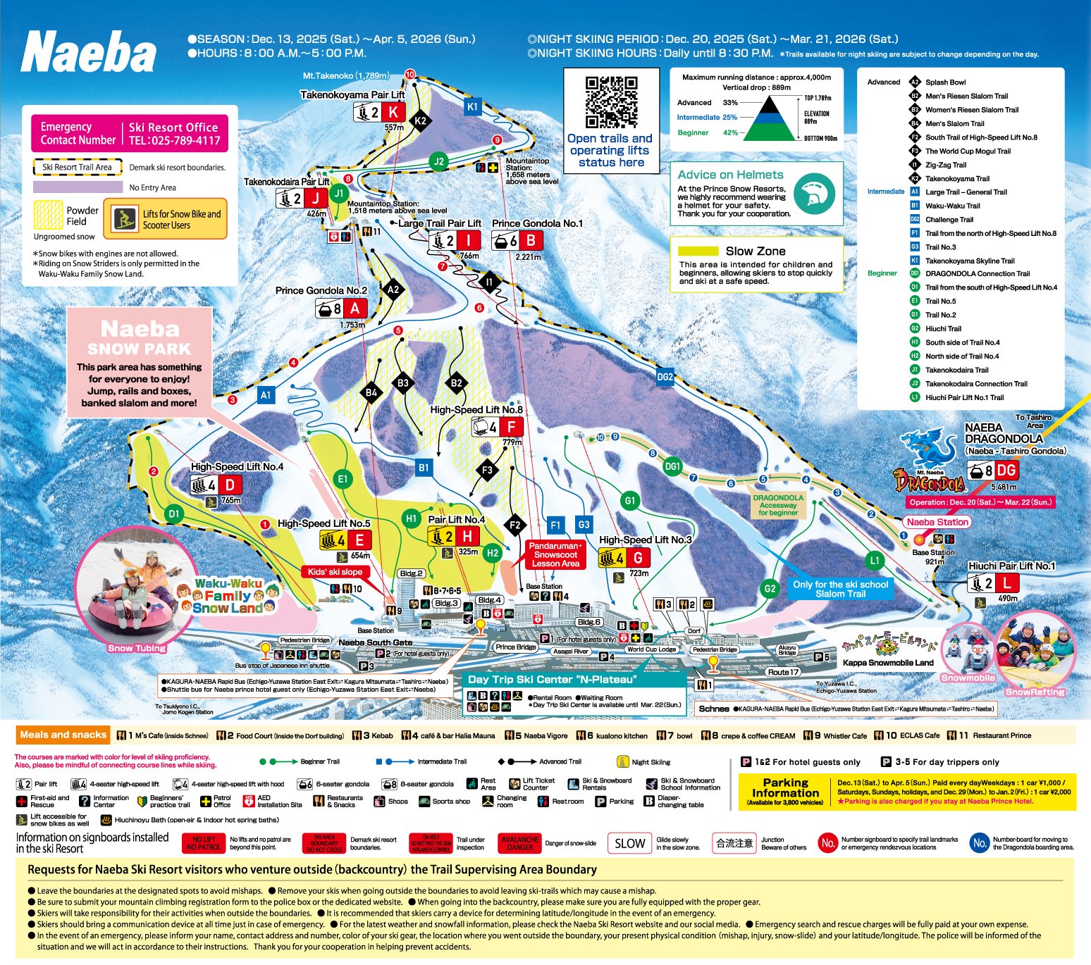 | F | 高速吊椅8号 | 4 | 779m | 9:00 A.M. ~ 4:00 P.M.(1月11日~3月2日期间的每周六及周日,以及12月28日~1月5日、1月13日以及2月24日) |