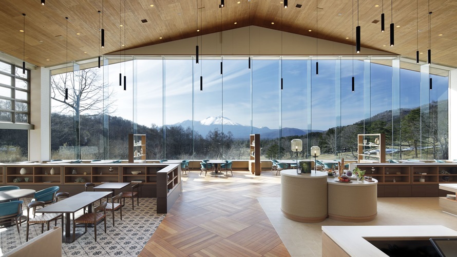在9米高的全景窗戶上欣賞淺間山的壯麗景色時,
