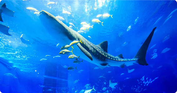 어류최대의 고래상어를 박력있는 거대수조에서 관찰. 오키나와의 바다를 통째로 체감할 수 있고, 몇번을 방문해도 새로운 만남과 발견이 있는 관광스폿