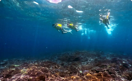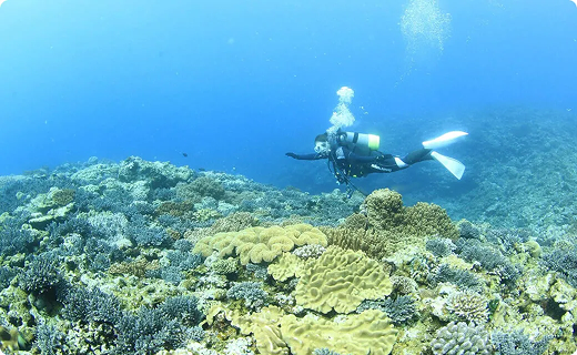 가족끼리 기노완의 바다를 만끽! 다이빙 미경험자도 안심. 강사 동행으로 6세부터 참여 가능.