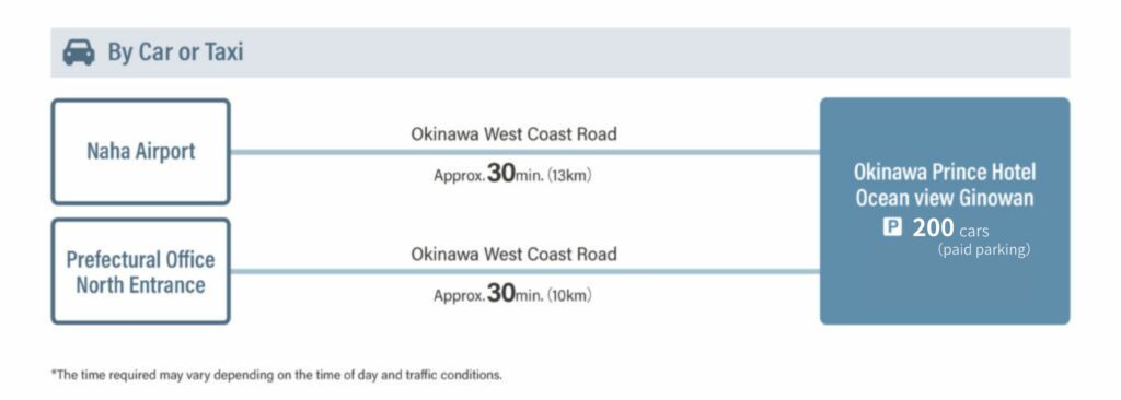 From Naha Airport: About 30 minutes via Nishi-Kaigan Road (non-toll road)