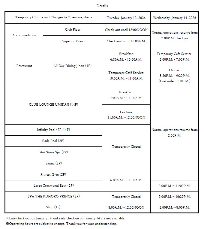Okinawa Prince Hotel Ocean View Ginowan will be temporarily closed from 12:00NOON. on Tuesday, January 13, 2026, to 2:00P.M. on Wednesday, January 14, 2026, for legal annual electrical inspections and maintenance of the pool and other facilities.
