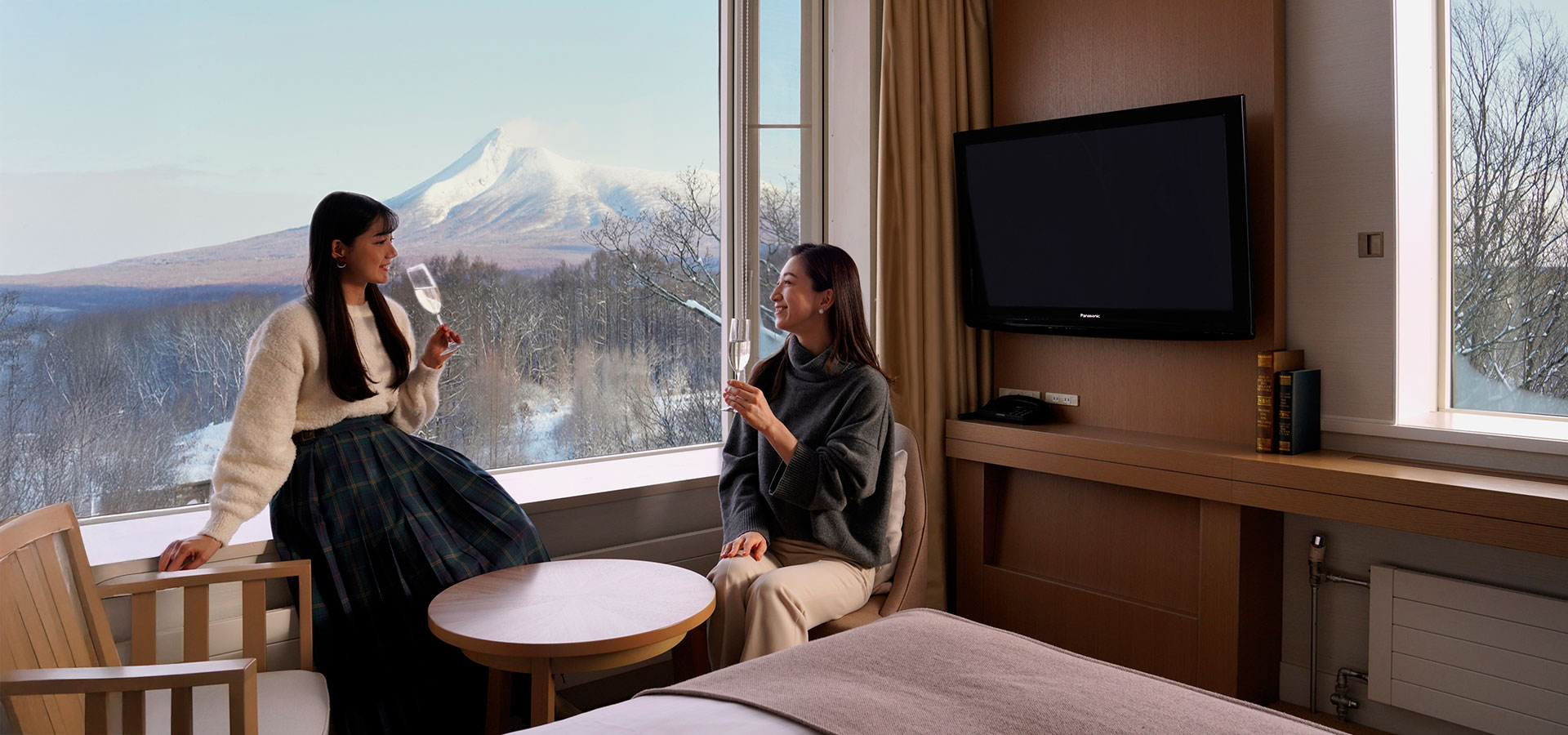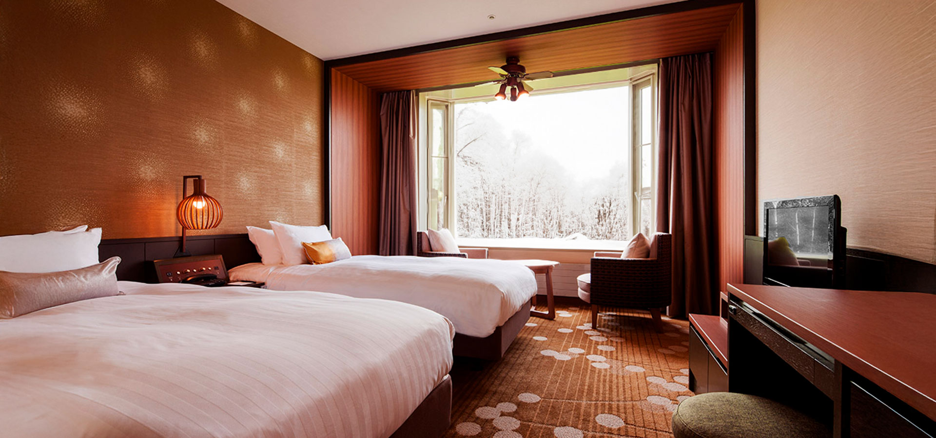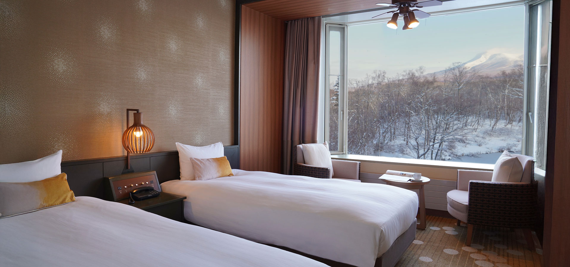 About usThe guest rooms are decorated using earth colors to imbue them with natural atmosphere, and come in five types, ranging from casual offerings to luxury experiences. The bay windows of the guest rooms treat you to a view of the picturesque seasonal beauty of Onuma.