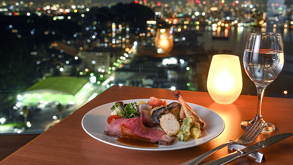 The atmosphere transforms from dinner time, offering refreshing views of the Seto Inland Sea.