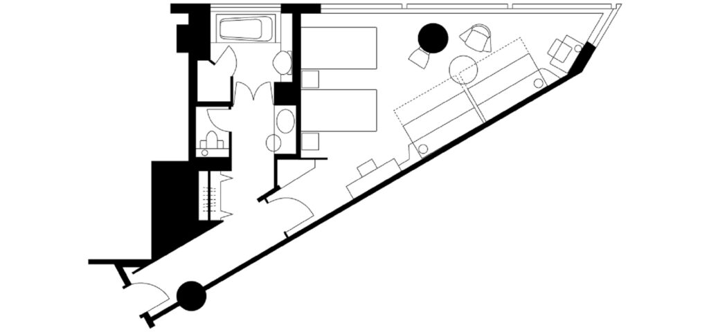 樓層: 14-15 層 客房面積: 53sq.m / 570.5sq.ft. 睡床尺寸:w110cm × H203cm / 2張 加床:w95cm × H185cm / 1張 容納人數:3人