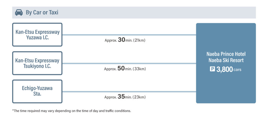 자동차로 오실 때에는 가네츠 고속도로에서 에치고 유자와 또는 츠키요노로 향하는 출구로. 열차로 오실 때에는 에치고 유자와역에서 내리셔서 노선버스를 타시면 됩니다. 또한 나에바 프린스호텔과 죠에츠 신칸센 에치고 유자와역 사이를 운행하는 호텔 투숙객 전용 무료 셔틀버스도 있습니다.