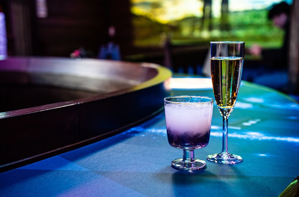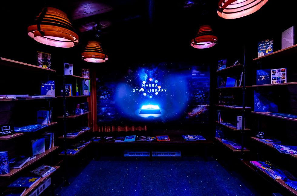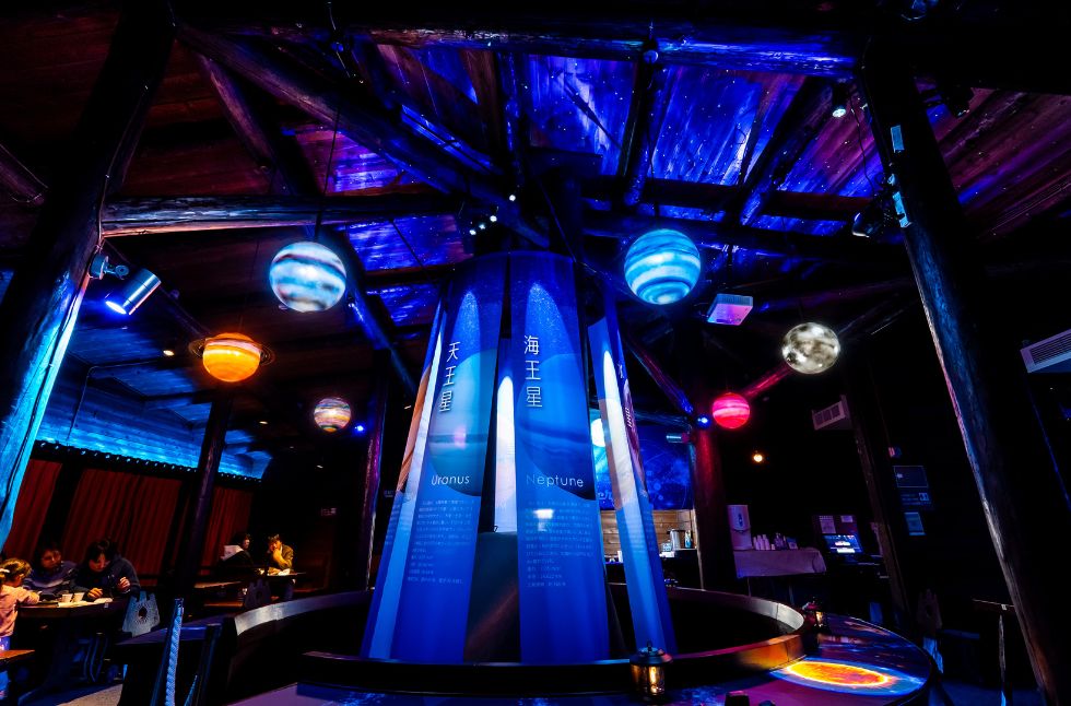 在收藏宇宙相關書籍的圖書區中,搭配星空主題的特色餐飲,