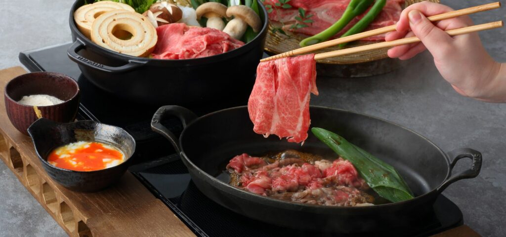 West Japan-style Sukiyaki: Our staff grills the beef right in front of you, seasoning it with rock sugar and soy sauce. This simple cooking method brings out the natural umami and savory aroma of the meat.