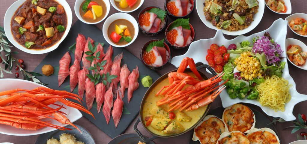 Enjoy a dinner buffet featuring a wide selection of Hokkaido’s local specialties, including seared Japanese beef sushi prepared at the live performance corner, boiled snow crab (thorny snow crab and red snow crab), seafood rice bowls, and tempura of tarako (cod roe) from Funka Bay.