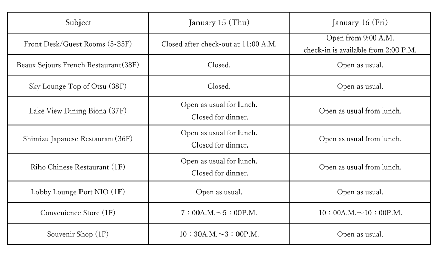 Lake Biwa Otsu Prince Hotel will be closed for maintenance as follows to conduct electrical equipment inspections required under the Electricity Business Act.