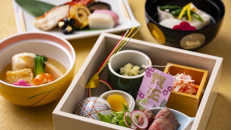 January 1 Japanese-style Breakfast or Japanese/Western Buffet Please inquire at the front desk for the breakfast venue. The Japanese-style breakfast is a traditional set meal with ozoni (mochi soup) and Japanese dishes, not a multi-tiered osechi box.