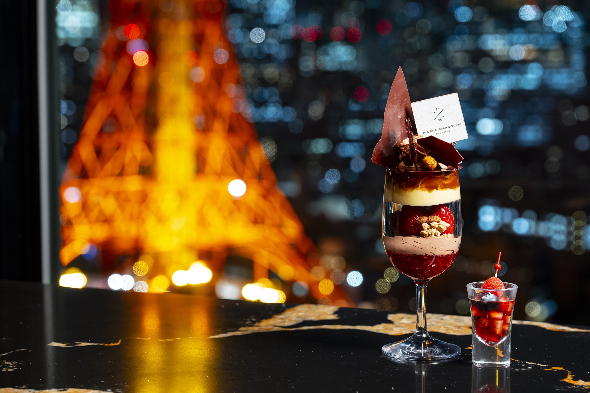 聖代提供兩款選擇:以東京鐵塔為靈感打造的「Sky Tower Parfait」,以及使用皮耶.馬可里尼(Pierre Marcolini)原創調配可可脂巧克力製作的「Chocolate Strawberry Parfait」。