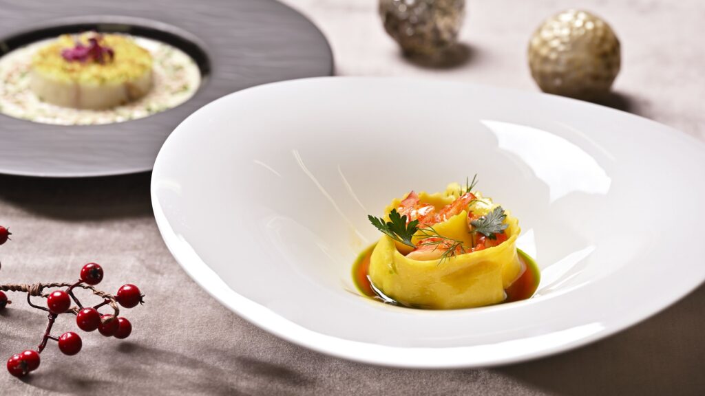 The pasta course features ravioli filled with the bounty of both sea and land. Carefully cooked, succulent lobster and the rich flavor of foie gras deliver a luxurious and satisfying depth of taste.