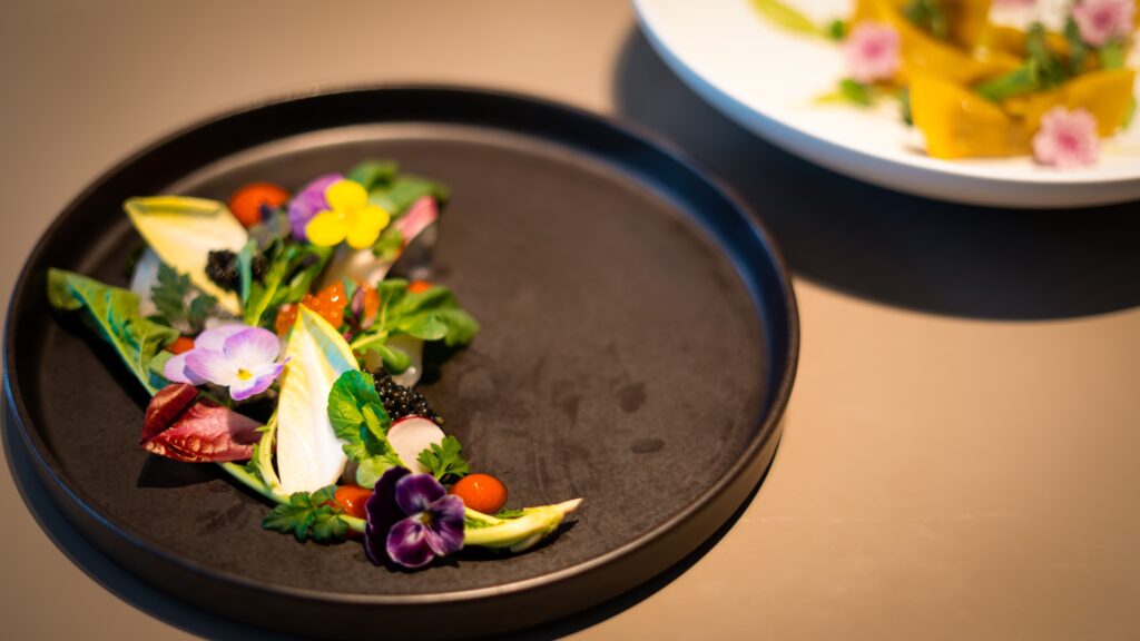 For the pasta course, we present agnolotti filled with the rich flavors of Tokyo Beef, carefully sealed within delicate pasta. Please enjoy it together with gently sweet green pea purée and marinated radish, elegantly arranged to resemble four stars in celebration of the award.