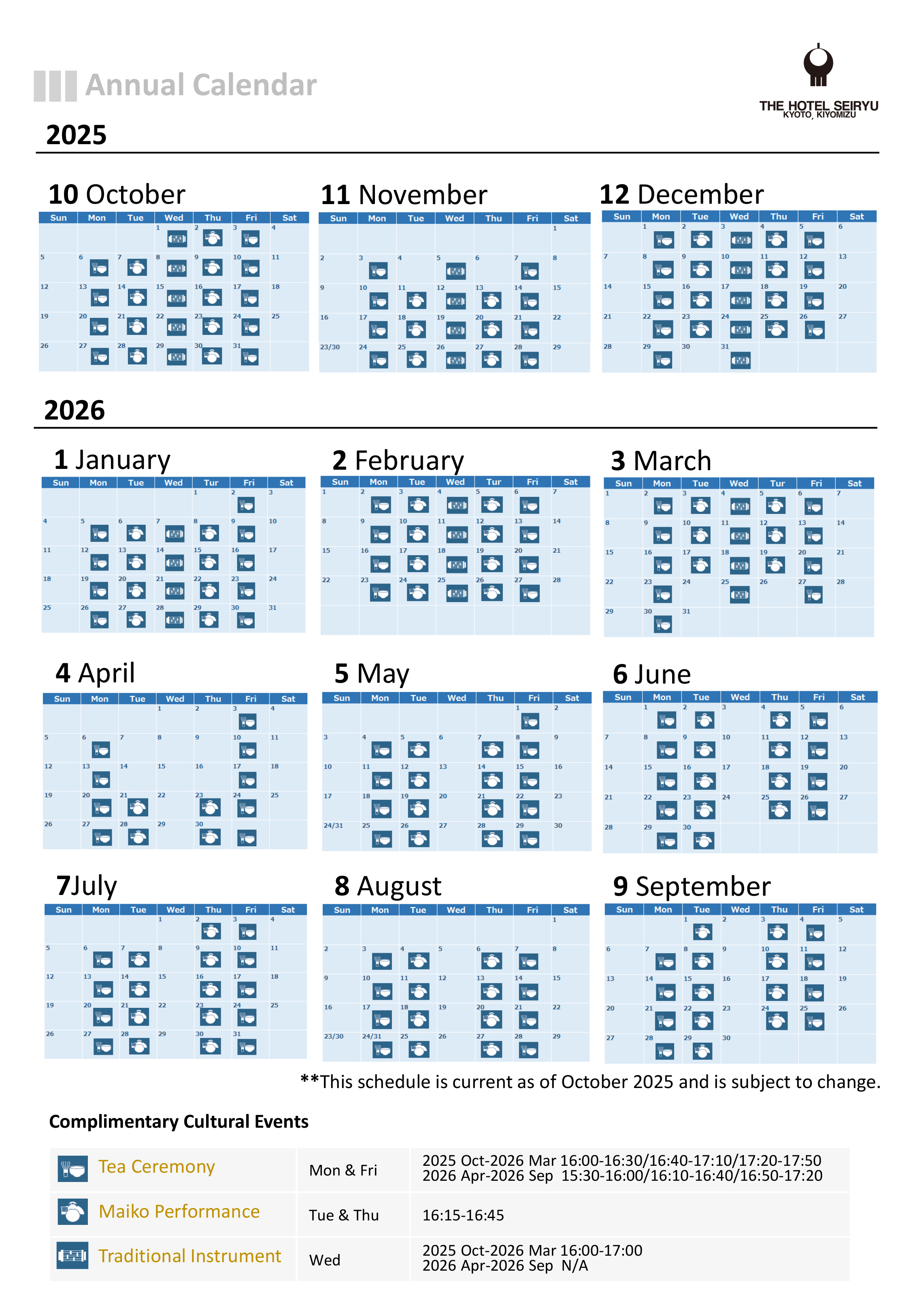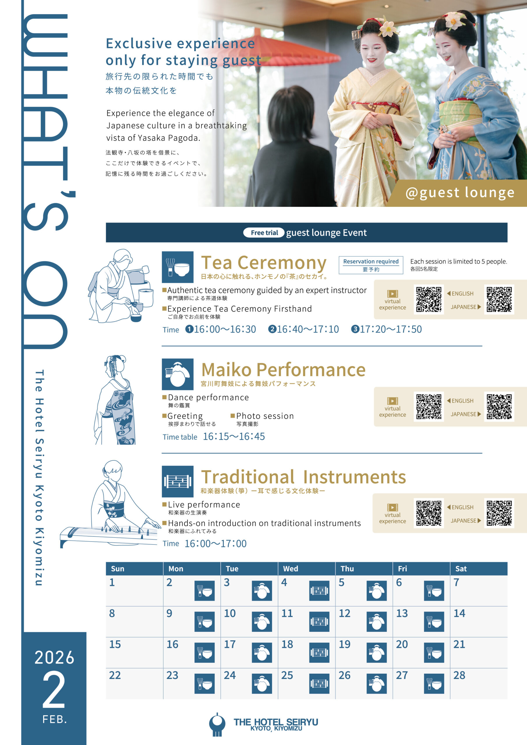 마이코 공연, 다도, 전통 악기 체험 등 모든 활동은 숙박 고객님께 무료로 제공됩니다.
