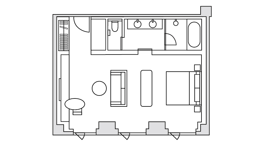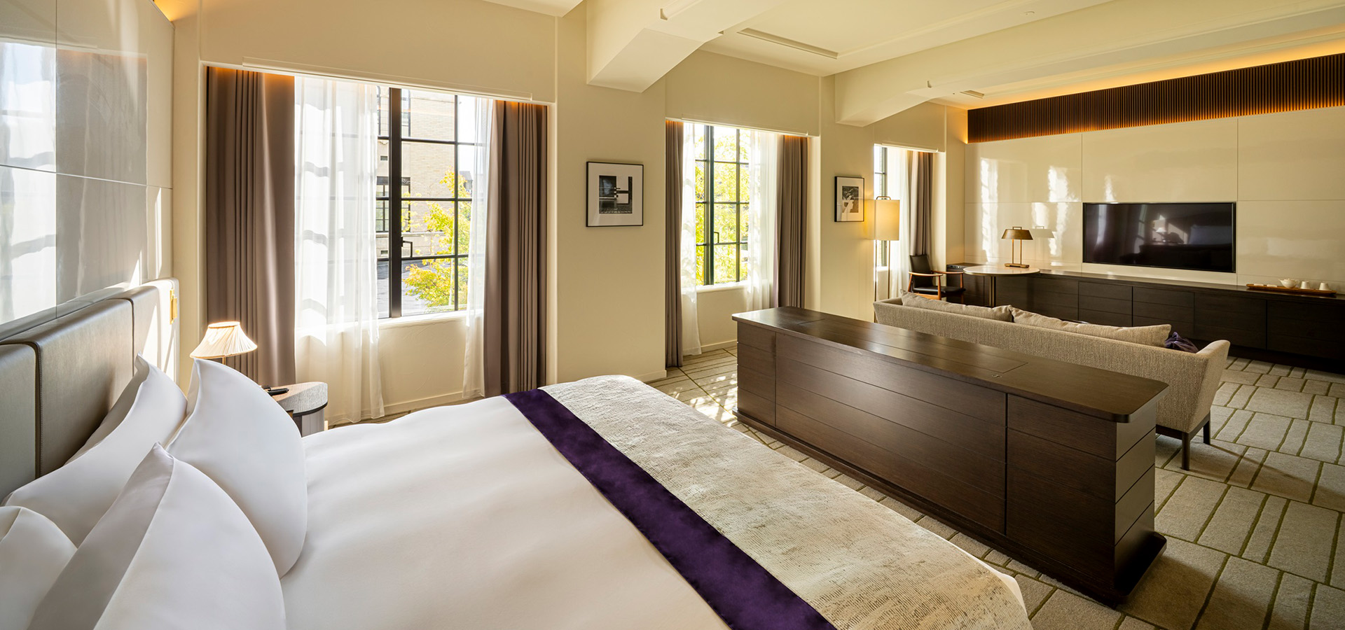 A 66 sqm sanctuary where timeless grace and contemporary comfort quietly intertwine. Set within the historic former classroom, the Executive King features a king-sized bed and classic furnishings that evoke the warmth of Kyoto craftsmanship and quiet nostalgia. Through the window, the tranquil courtyard once admired by schoolchildren invites guests to pause and rediscover beauty in stillness.