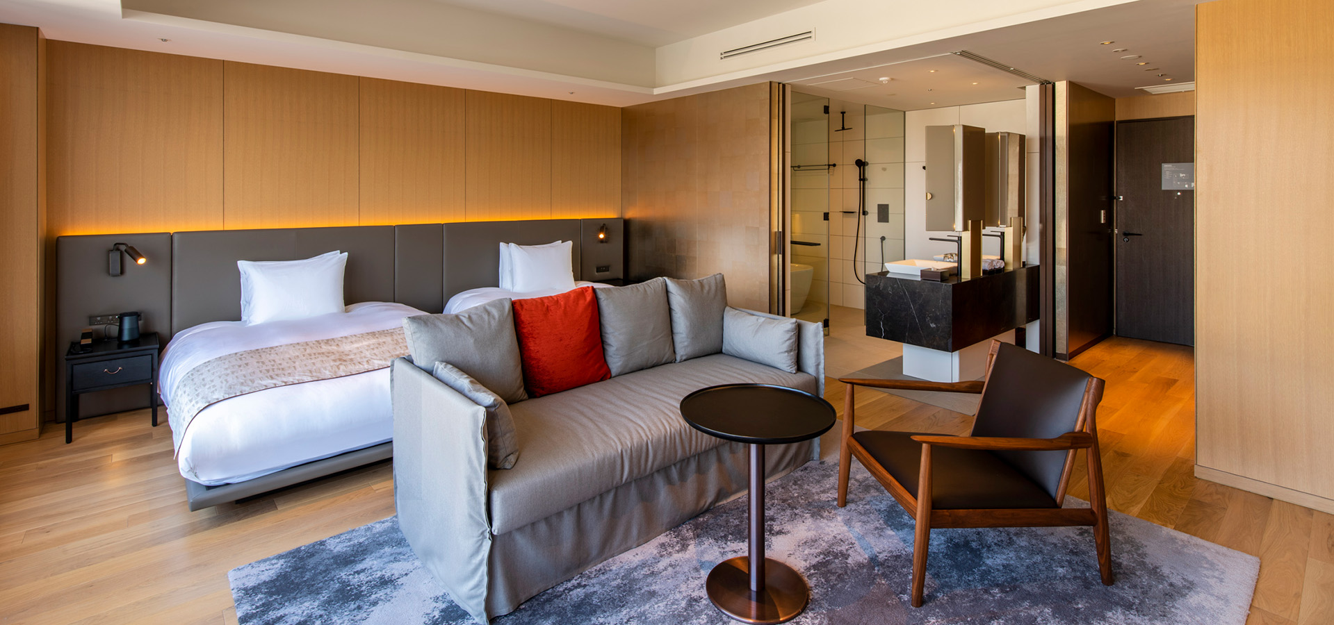 A 66 sqm sanctuary where timeless grace and contemporary comfort quietly intertwine. Set within the historic former classroom, the Executive King features a king-sized bed and classic furnishings that evoke the warmth of Kyoto craftsmanship and quiet nostalgia.