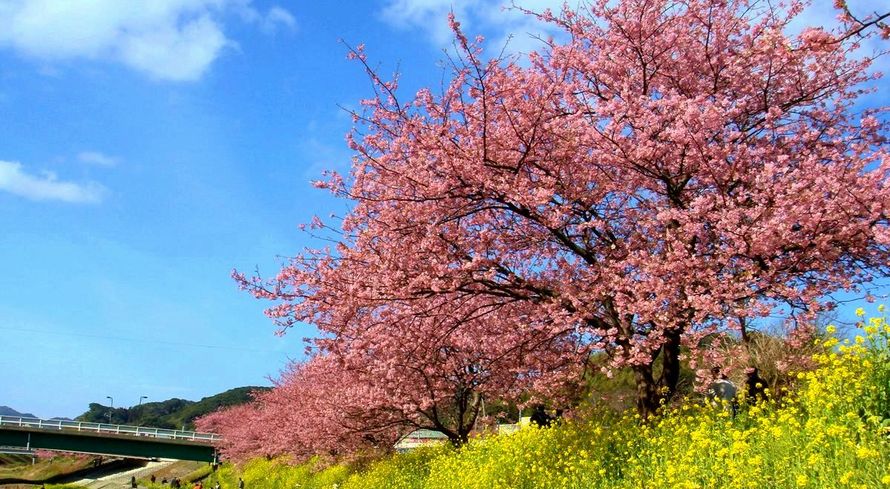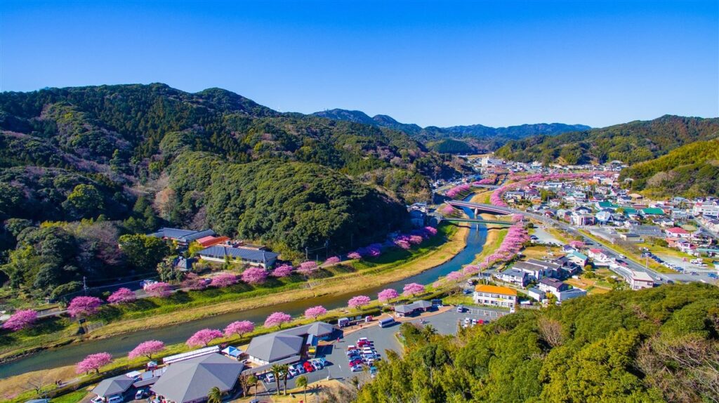 Minami-Izu Town is located at the southern tip of the Izu Peninsula in Shizuoka Prefecture. Along both banks of the Aono River, approximately 800 cherry blossom trees stretch for 4.2 kilometers, creating a stunning scenic view.