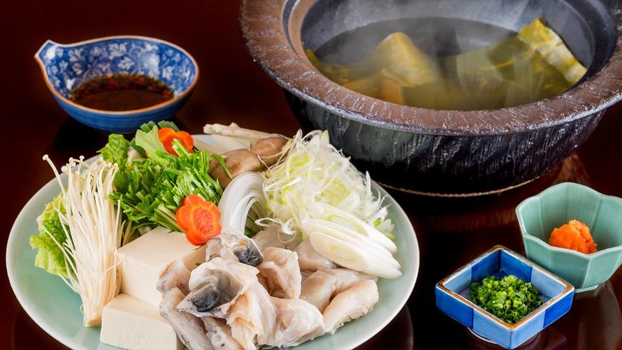 Fugu hot pot with napa cabbage, assorted vegetables, green onions, condiments, and ponzu