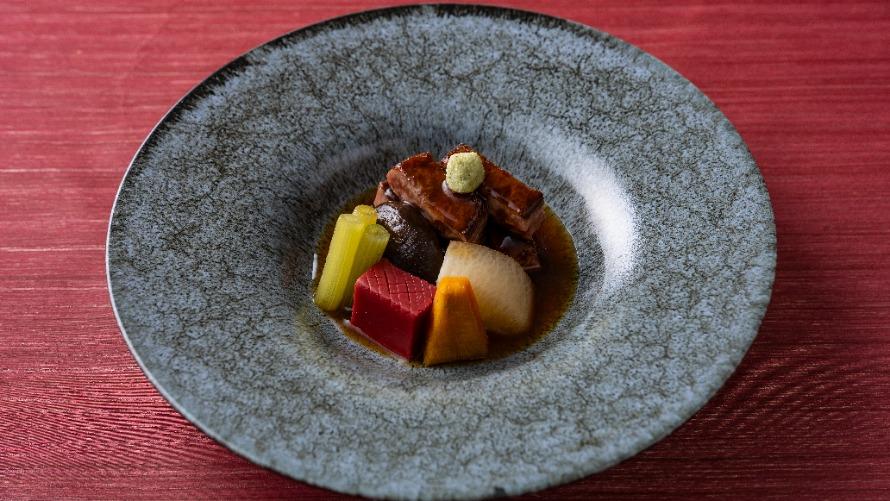 A delicate dish featuring seasonal ingredients and the rich flavor of premium Japanese Wagyu beef, complemented by a light, savory sauce made with bonito broth, soy sauce, and mirin.