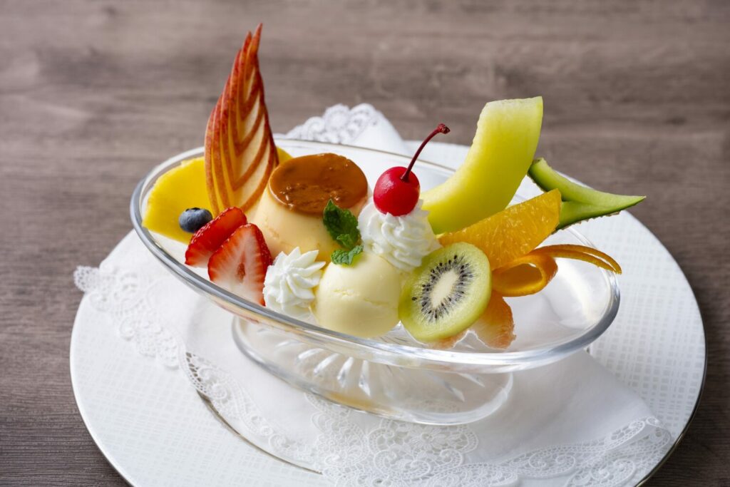 Traditional Japanese almond pudding served with fresh fruits is a refreshing summer dessert that embraces Showa flavors. This Pudding is available at Lounge Momiji in Grand Prince Hotel Shin Takanawa (1F).