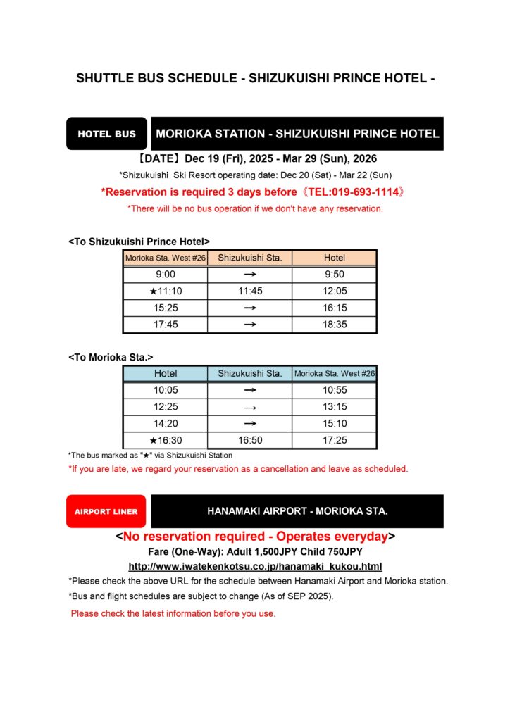 Morioka Station / Shizukuishi Station ⇔ Shizukuishi Prince Hotel Free Shuttle Bus Timetable