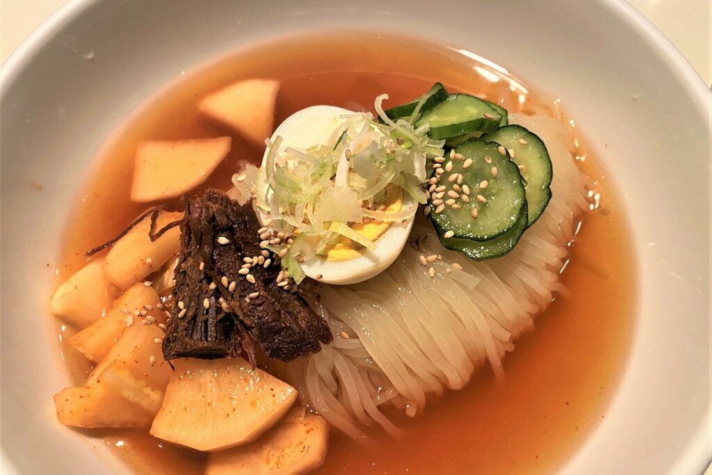 盛岡冷麵的特色在於麵條具有強勁的彈性,表面光滑,滑順易入口。麵條、湯頭與泡菜三者完美融合的美味,正是盛岡冷麵獨有的魅力所在。食道園官方網站>Add Button