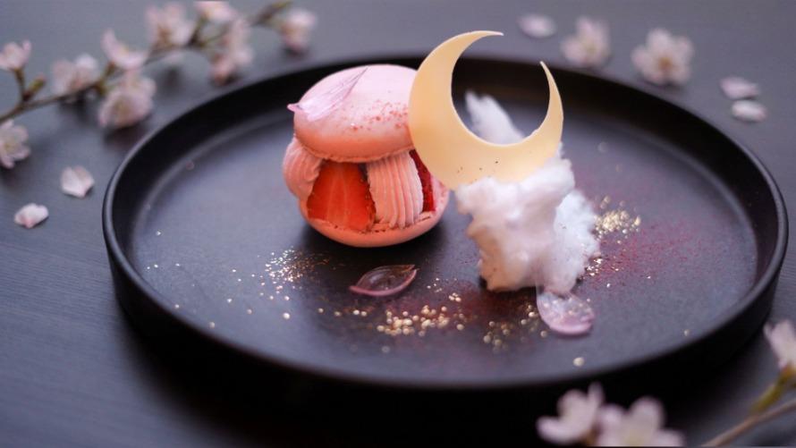 A sakura-flavored macaron is accompanied by sugar-crafted cherry blossom petals, cloud-like cotton candy, and moon-shaped chocolate, creating an elegant scene that evokes a spring evening under the moon.