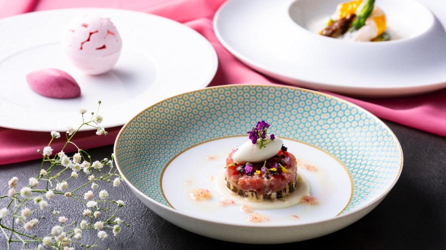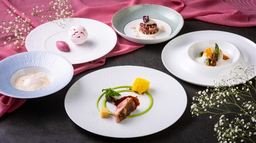 Featured dishes include langoustine layered with a light white shrimp mousse on a rich sauce Américaine, and a Tokyo egg parfait paired with velvety truffle mousse and seasonal spring vegetables — each beautifully crafted plate showcasing the elegance of premium ingredients adorned with the colors of spring.