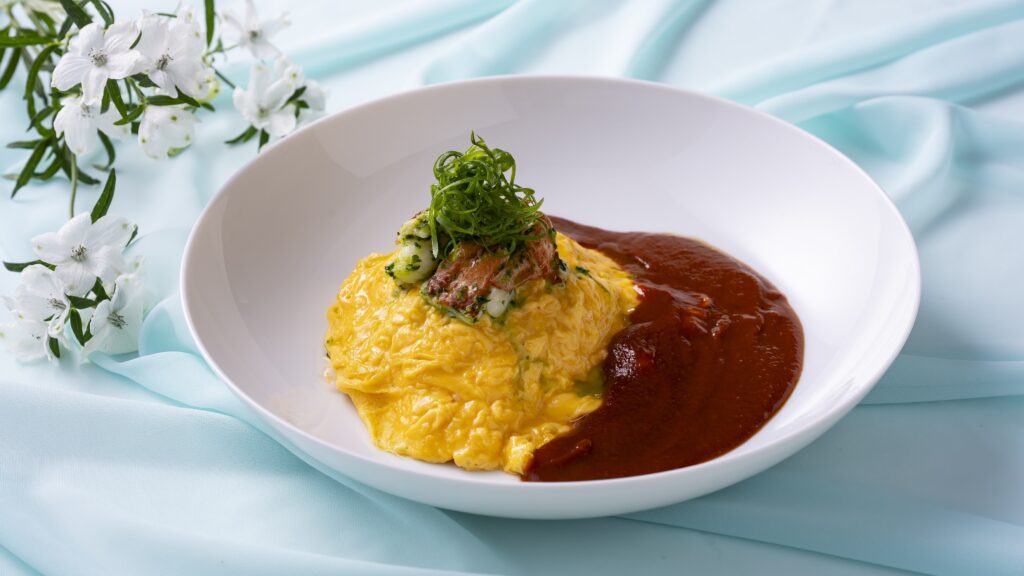 Our lounge’s signature “Fluffy Omurice” is presented as a limited early-summer dish topped with seasonal lobster. A soft, half-runny omelet is paired generously with a rich Americane sauce accented with tomato. To finish, lobster sautéed in parsley butter and Kujo green onions are added as toppings. Enjoy the luxurious harmony created by the deep, concentrated umami of lobster combined with this indulgent omurice.