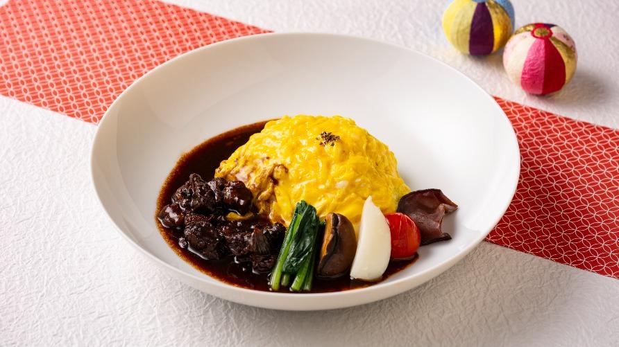 A soft, half-cooked omelet made with fresh Tokyo-laid eggs is paired with a rich, full-bodied beef stew in a red wine base.