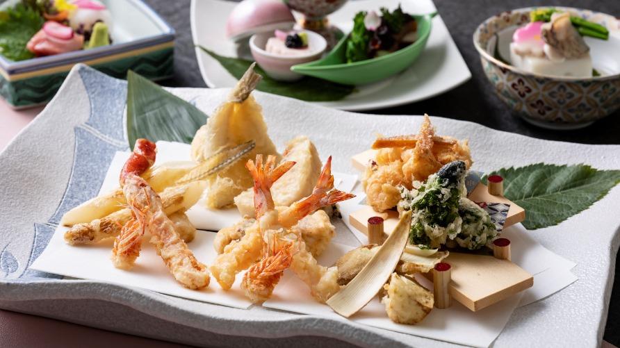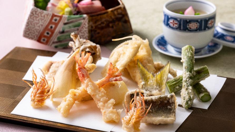 A lunch course featuring freshly fried tempura of spring ingredients, including bamboo shoots and asparagus.