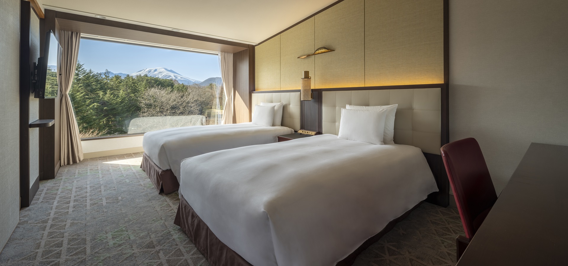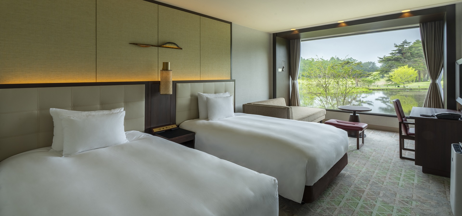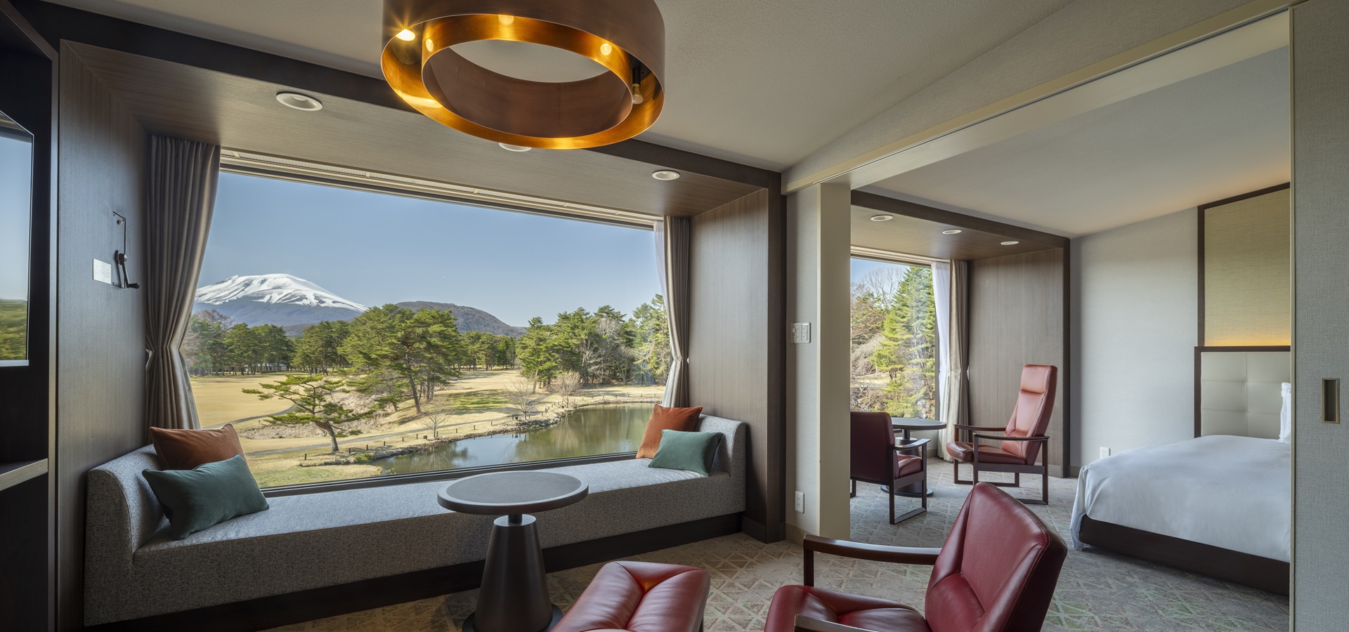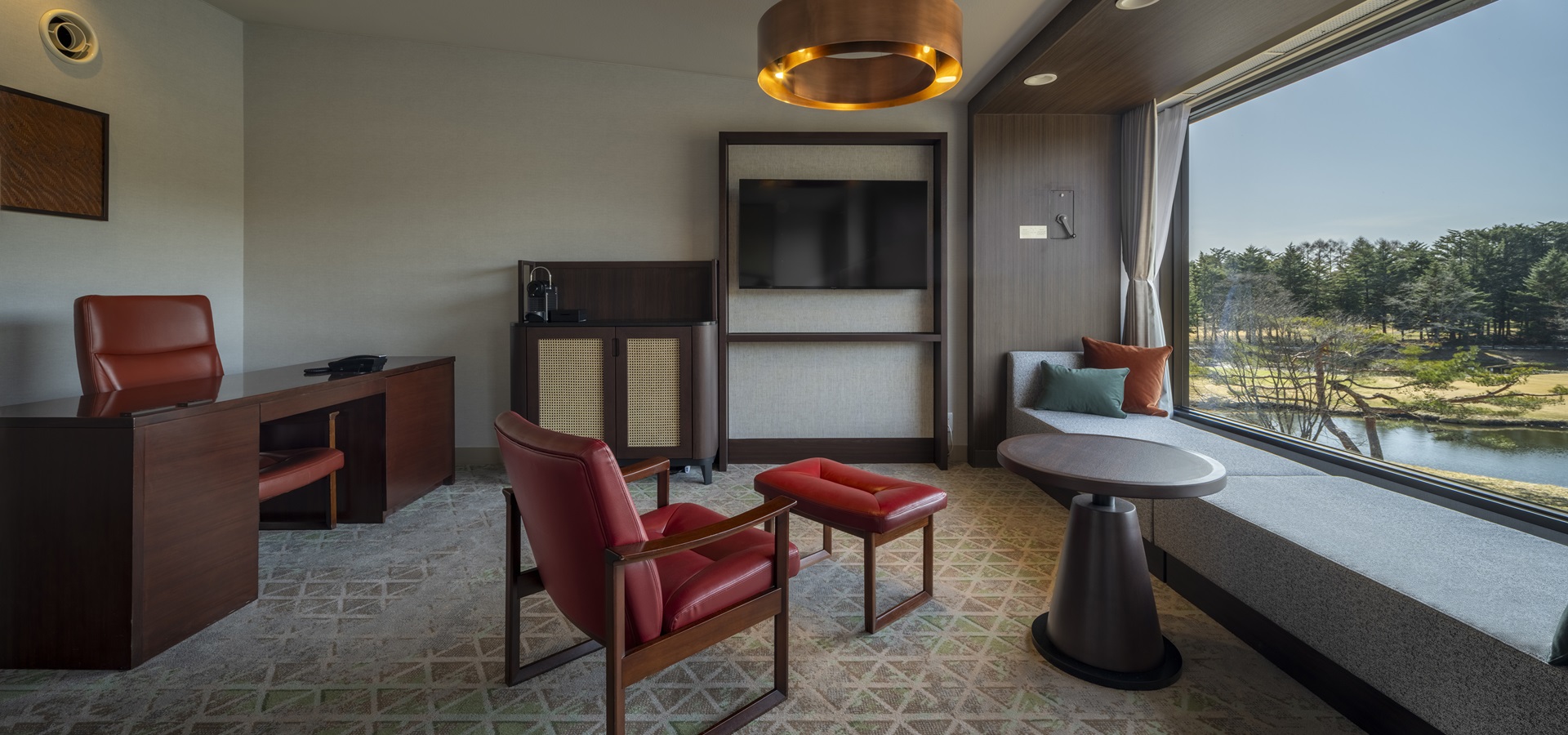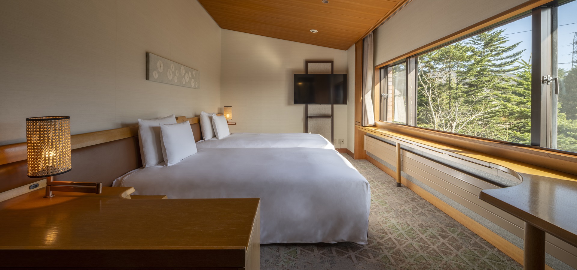 창밖으로 계절마다 아름답고 다채로운 가루이자와의 자연이 펼쳐지는, 편안하게 시간을 보낼 수 있는 객실.